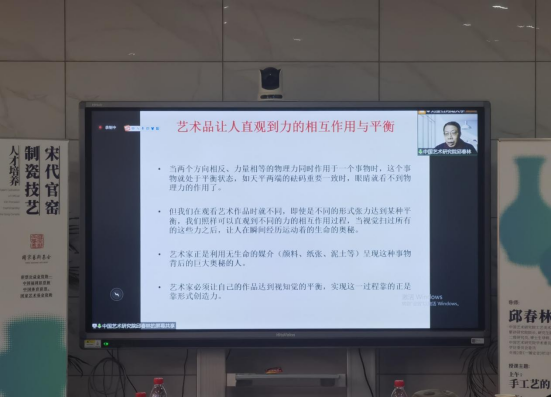 3月5日,邱春林教授通过视频会议为《宋代官窑制瓷技艺人才培养》项目组全体学员授课。必赢bwin官方网站经理席卫权出席活动。邱春林教授系中国艺术研究院工艺美术研究所所长、紫砂研究院经理、研究生院设计系主任、二级研究员、博士生导师、中国艺术研究院学术委员会委员、学位委员会委员、央视2套《一锤定音》栏目专家。 邱春林教授将全天的课程分为两大部分进行,第一部分主题为“日常生活审美化与当前手工艺的创作”,邱春林教授讲述了西方现代主义艺术和工业社会的审美内容,包括后现代艺术对“艺术”与“生活”之间界限的消除、后工业社会日常生活中的审美化潮流和学界对此所持的态度、对后工业社会消费时代审美化的内驱力的批评、后工业社会消费时代的审美特征、谁在主导审美流行、审美泛化中的手工艺创作、中国闲情——生活美学的传统经验等内容。 谈到艺术与生活之间的界限时,邱教授表示,艺术可以出现在任何地方,可以是任何事物,偶然性的表演或事件、身体以及其他任何可感物体。大众文化中的琐碎之物和基础的消费商品等都可以与艺术发生关联,艺术与日常生活之间没有绝对界限。针对当下“谁主导审美流行”这一问题时,邱春林教授认为,在欧美社会,商业资本驱动力大,中产阶级作为主流社会阶层主导着审美流行;而在中国社会,审美流行中尽管不乏行政和商业资本的力量,但具体还是由人民推动日常生活审美潮流。邱教授从现代艺术发展的背景出发,为学员们在当下社会对创作官瓷这一传统艺术构建了新的设计思维与创作落脚点,帮助大家深入认识到艺术创作应与生活、与人民紧密关联。 邱春林教授在下午带来了第二部分的授课,题为“艺术品的形式张力和视觉平衡”。他围绕什么是平衡、艺术要追求平衡、艺术品让人直观到力的相互作用与平衡、艺术的平衡是打破常规的平衡、艺术品对空间的环境塑造力源自形式张力、艺术的平衡是视知觉平衡、艺术构图的平衡是精细组织的结果等多个小话题展开。 邱春林教授从不同角度阐述了“平衡”的意义,强调了艺术的平衡与常规的平衡之间的异同,提倡从构图、心理等视知觉感受中打破物理平衡,追求艺术平衡,继而实现“艺术是揭示生命所蕴含的内在秘密”这一重要的作用。 除了系统的理论学习外,邱教授还展示了一系列作品图片,让在场学员形象地感受到了艺术品的形式张力及视觉平衡的重要性。学员们在丰富的艺术鉴赏中提高了审美眼光与批判力,拓宽了对“美”的认知,对把握官瓷艺术创作有了新的方向和感悟。