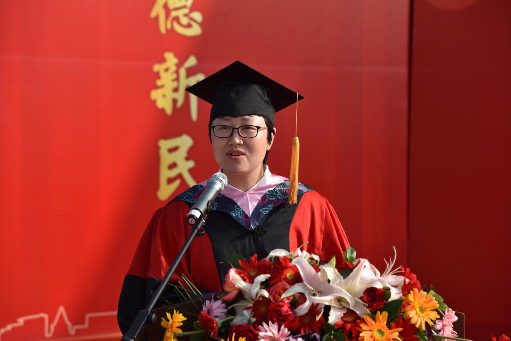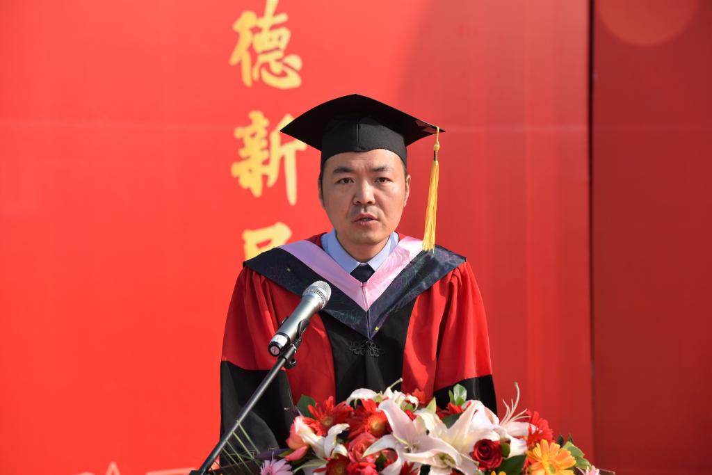 贾卓燊代表全体毕业生,向一直以来悉心教导、诲人不倦的老师们表达衷心的感谢。他与在场全体毕业生共勉,作为学院培养的青年学子,要始终坚定理想信念,用奋斗的青春成就未来,在青春的赛道上跑出更好成绩。