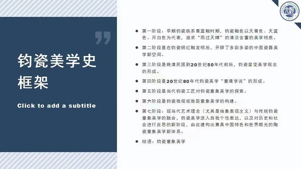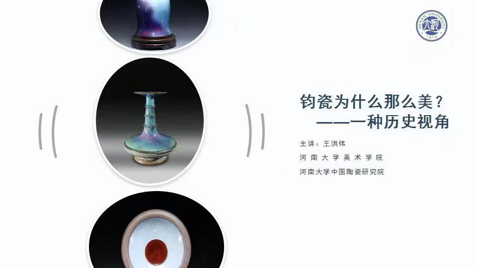 主讲人王洪伟立足钧瓷发展全史,阐释了当代中国钧瓷的意象美学。讲座分七个阶段讲述钧瓷美学特征:第一阶段:早期钧瓷铁系青蓝釉时期清淡含蓄的美学特质。第二阶段:钧瓷铜红釉创烧后,开辟多彩多姿的中国瓷器美学新空间。第三阶段:晚清民国到1950年代前后,钧瓷窑变美学观念形成。第四阶段:1980年代钧瓷美学“意境学说”形成。第五阶段:当代钧瓷工匠对钧瓷意象美学的探索。第六阶段:钧瓷微观意象美学构建。第七阶段:现代艺术理念与传统中国钧瓷意象美学的融合。