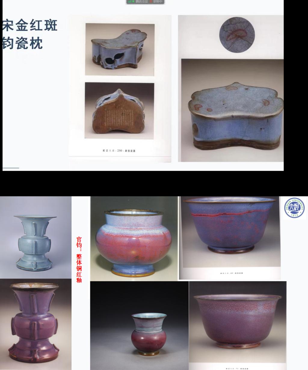 首先,王洪伟简要梳理了钧瓷发展的七个阶段,介绍了钧瓷釉质釉色特性、古代钧瓷匠人制瓷的形制方法以及中原钧瓷种类,指出高温还原火烧制钧瓷铜红釉以及铜系青蓝为陶瓷窑变艺术的成熟化;钧釉在高温下流动的诸多色彩和纹路形象地显示出各种独特地山水、动植物意境开创了钧瓷美学的新境界;中原三大钧瓷:铁系青蓝釉,钧瓷铜红釉,铜系青蓝釉,尤其是铜系青蓝釉形成了独特的钧瓷意象美学新境界。
