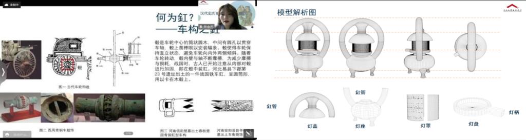 孙金杰从“釭”的由来、釭灯制造背景、釭灯的巧思之处、消失的原因、釭灯与现代灯具设计五部分展开。首先通过《说文解字》及《释名》中对“釭”的诠释引出“车构之釭”、“建筑之釭”、“灯构之釭”,并分析影响釭灯形态设计的因素。孙金杰以“海昏侯墓出土的鼎形双釭灯”为例,为大家呈现了3D模型解析图,对釭灯灯盖、釭管、灯盘、灯罩等构件展开了详细介绍,并对釭灯环保功能的工作原理展开具体说明。在对釭灯消失的原因进行探讨时,主讲人孙金杰围绕灯具制作材料的转变、新燃料的产生及社会环境的变化致使青铜釭灯逐渐退出时代舞台进行了详细的阐述。