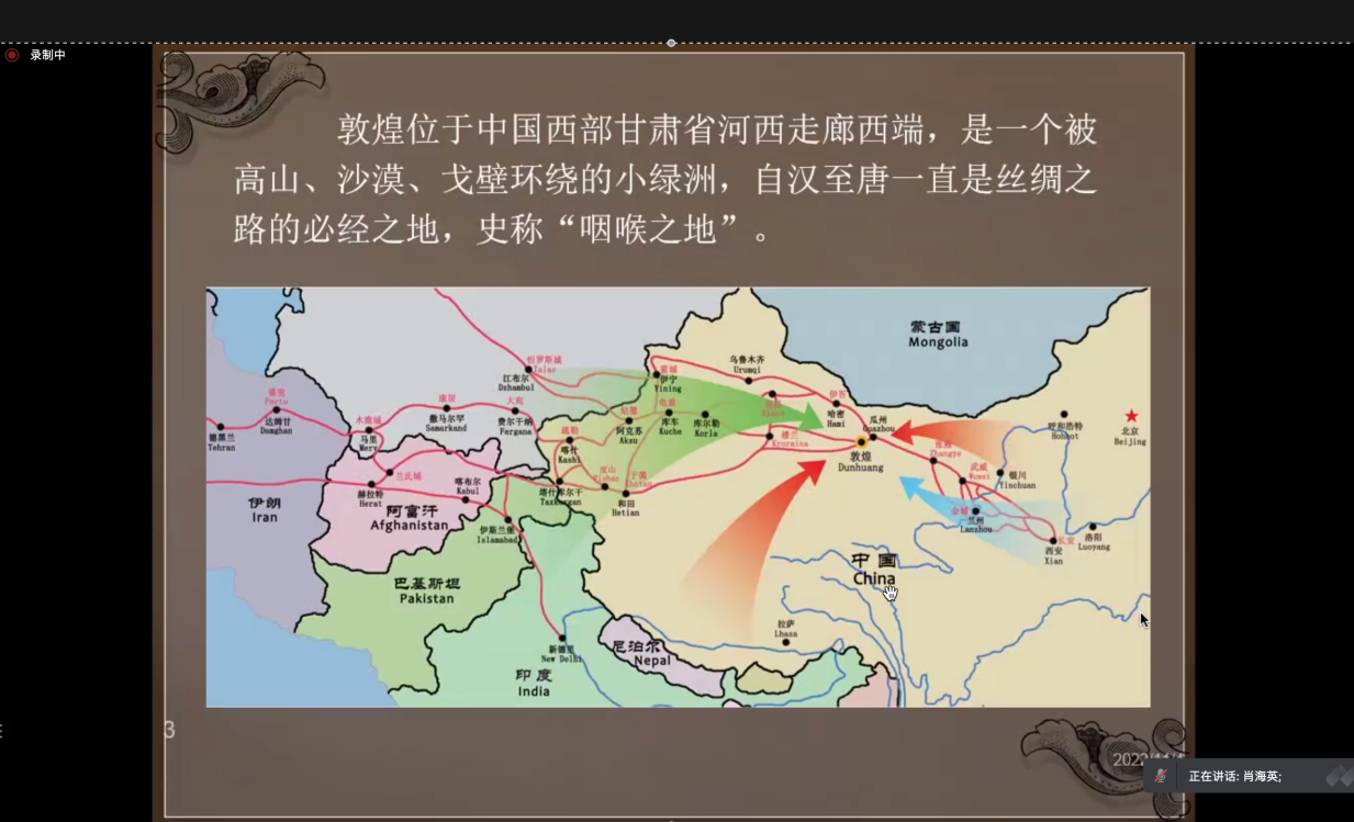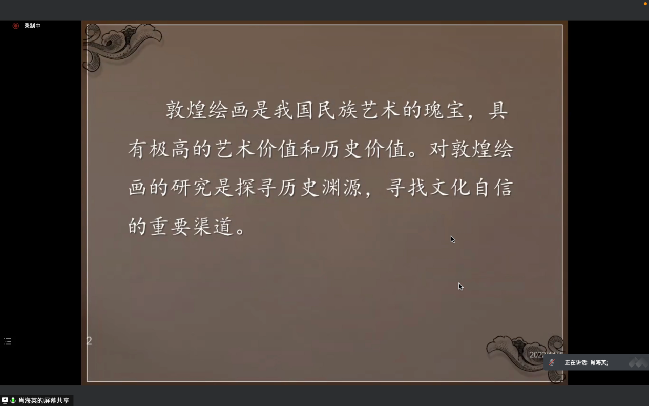 肖海英首先简要介绍了敦煌的历史,并指出敦煌从汉至唐一直是丝绸之路的必经之地,被称为“咽喉之地”,是我国民族艺术的瑰宝,具有极高的艺术价值和历史价值,对其展开全面、深入的研究就是要探寻历史渊源、寻找文化自信。