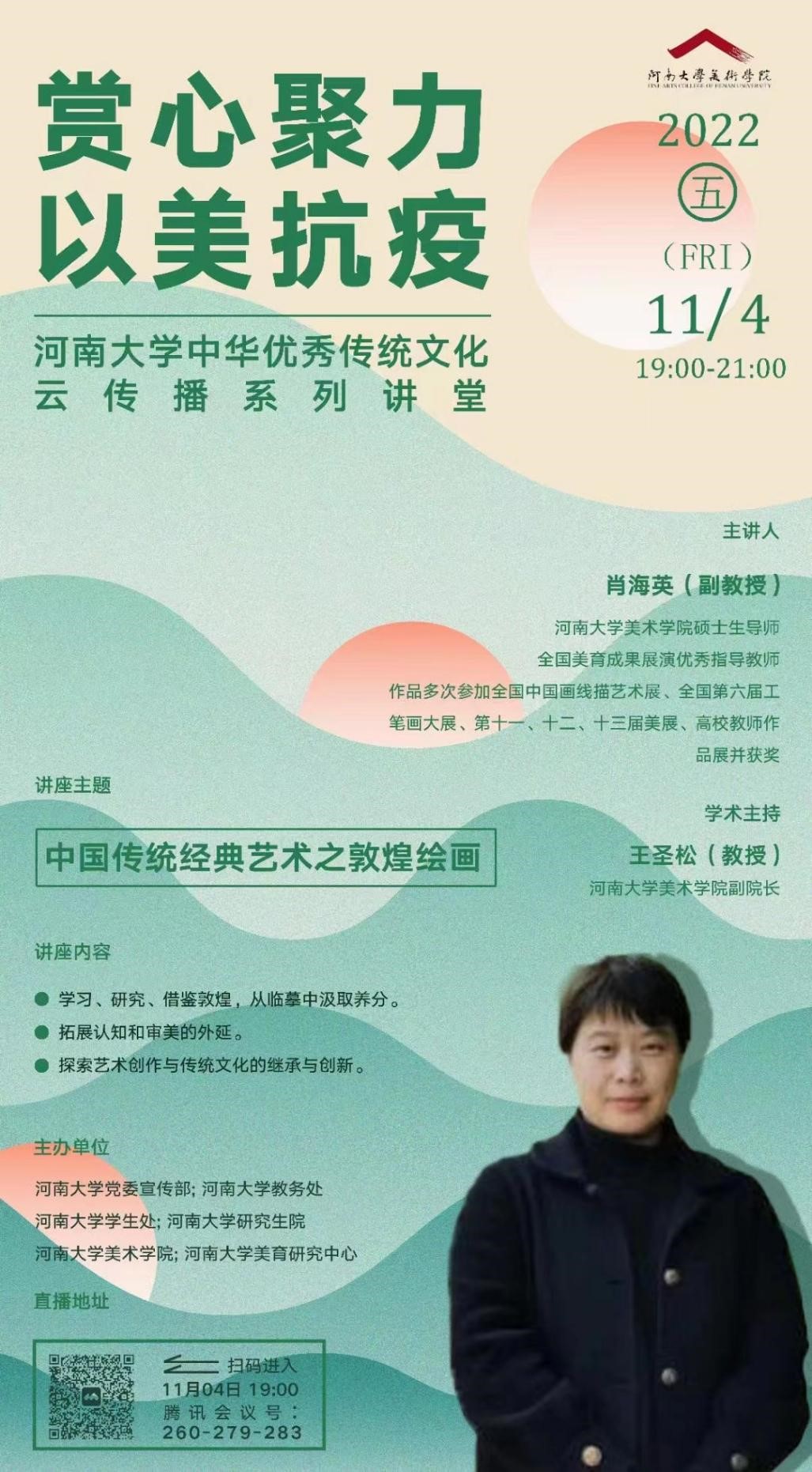2022年11月4日晚7点,“赏心聚力,以美抗疫——BWIN必赢官方中华优秀传统文化云传播”系列讲座第六讲,必赢bwin官方网站副教授肖海英主讲的专题讲座“中国传统经典艺术之敦煌绘画”以腾讯直播方式成功举办。必赢bwin官方网站副经理王圣松教授担任本讲学术主持。