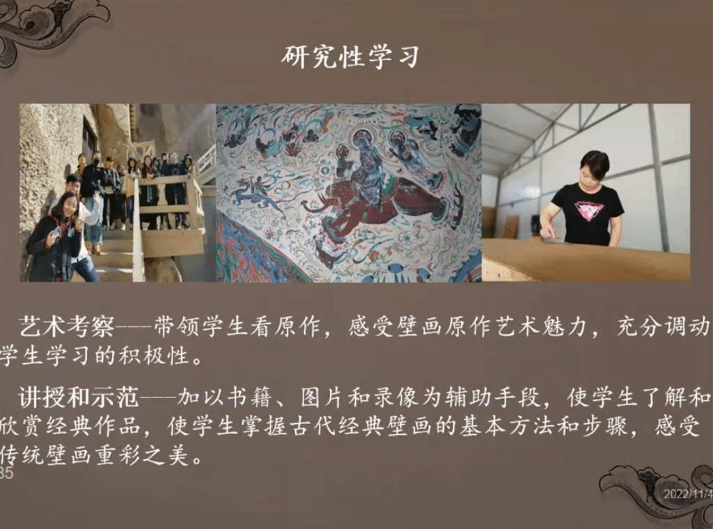 随后,肖海英介绍了研究性的学习步骤,以课程案例《九色鹿的故事》为例,带领同学们身临其境地感受了壁画的创作过程。