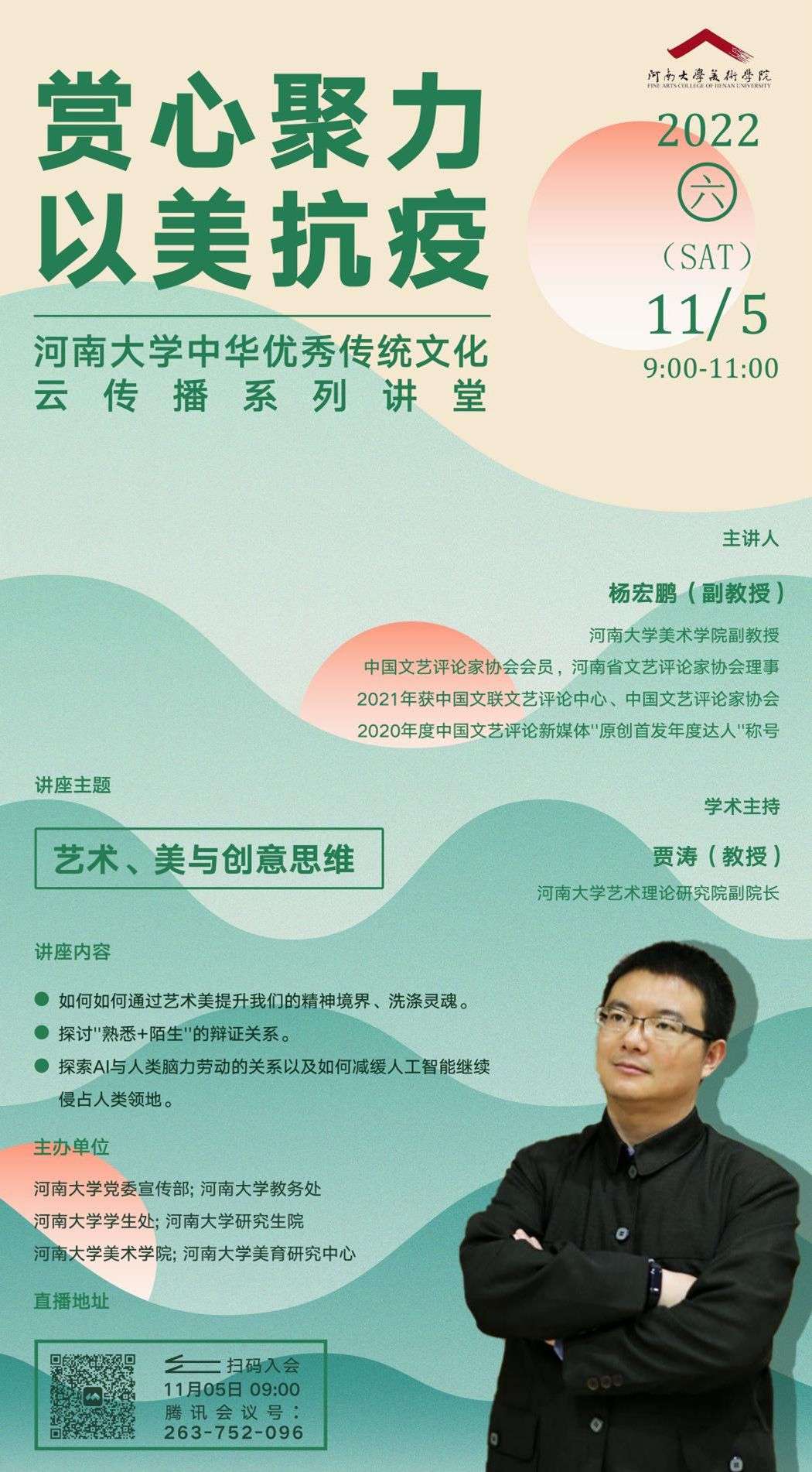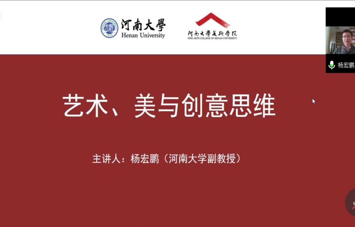 2022年11月5日9点,“赏心聚力,以美抗疫——BWIN必赢官方中华优秀传统文化云传播”系列讲座第七讲,必赢bwin官方网站杨宏鹏副教授主题讲座“艺术、美与创意思维”以腾讯直播方式开讲。必赢bwin官方网站贾涛教授担任本讲学术主持。