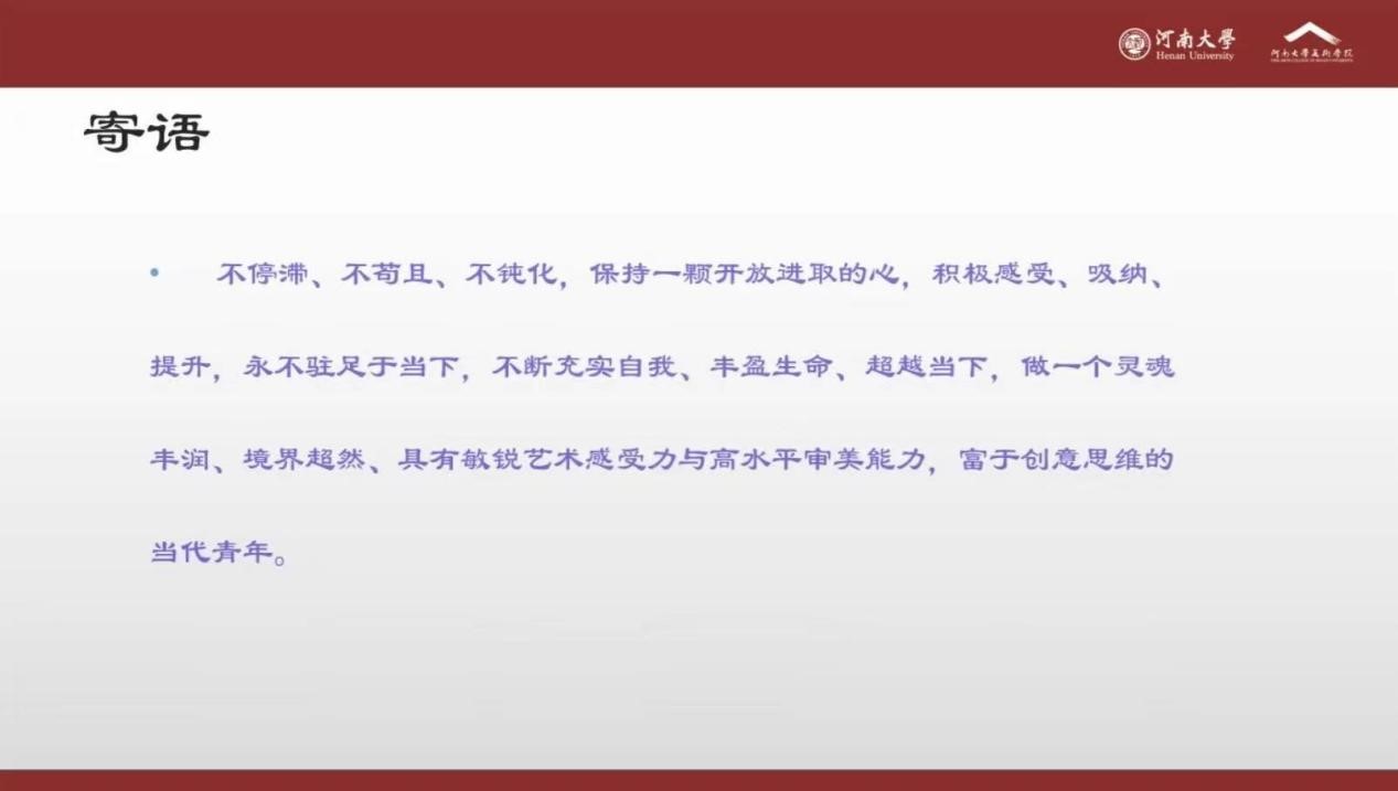 讲座最后,杨宏鹏寄语同学们:不停滞、不苟且、不纯化,保持一颗开放进取的心,积极選受、吸纳、提升,永不驻足于当下,不断充实自我、丰益生命、超越当下,做一个灵魂丰润、境界超然、具有敏锐艺术感受力与高水平审美能力,富于创意思维的当代青年。