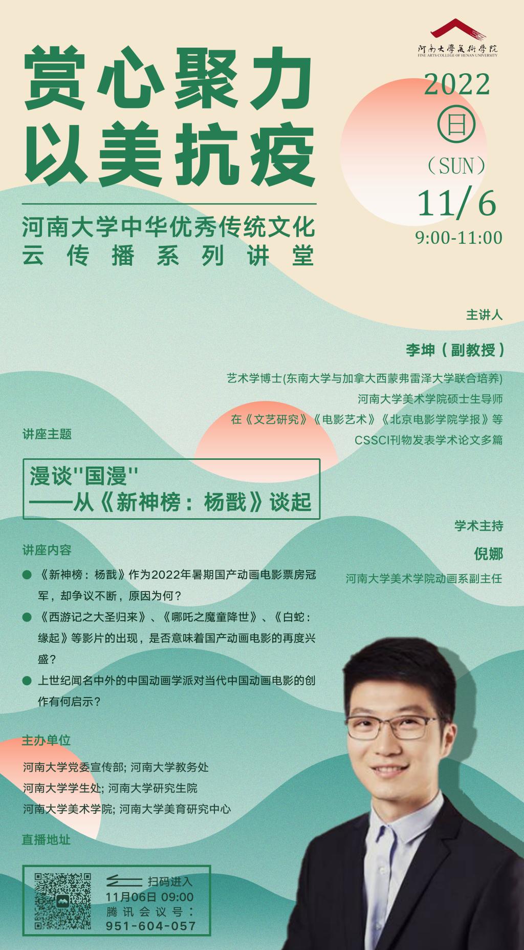 2022年11月6日上午9点,“赏心聚力,以美抗疫——BWIN必赢官方中华优秀传统文化云传播”系列讲座第八讲,必赢bwin官方网站副教授李坤主讲的“漫谈‘国漫’——从《新神榜:杨戬》谈起”专题讲座以腾讯直播方式成功举办。必赢bwin官方网站动画系倪娜副教授担任本讲学术主持。