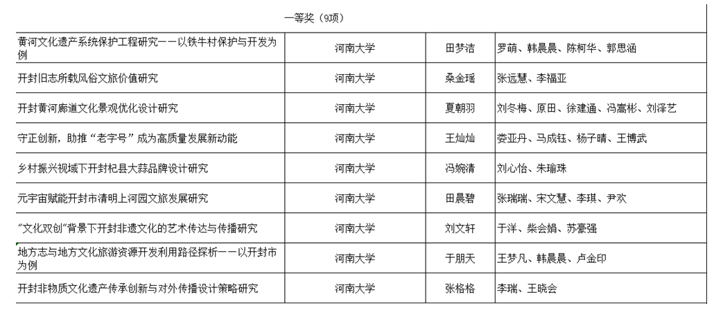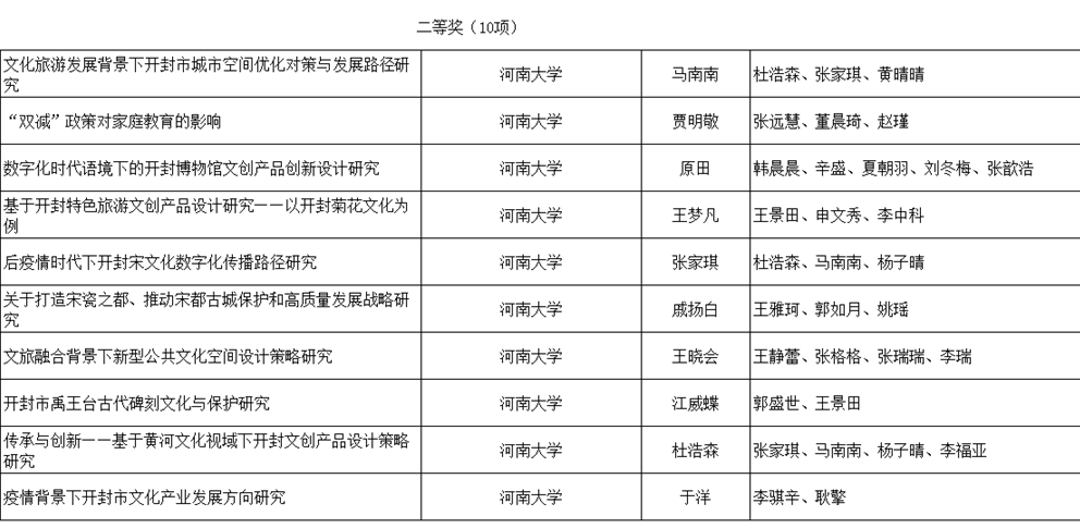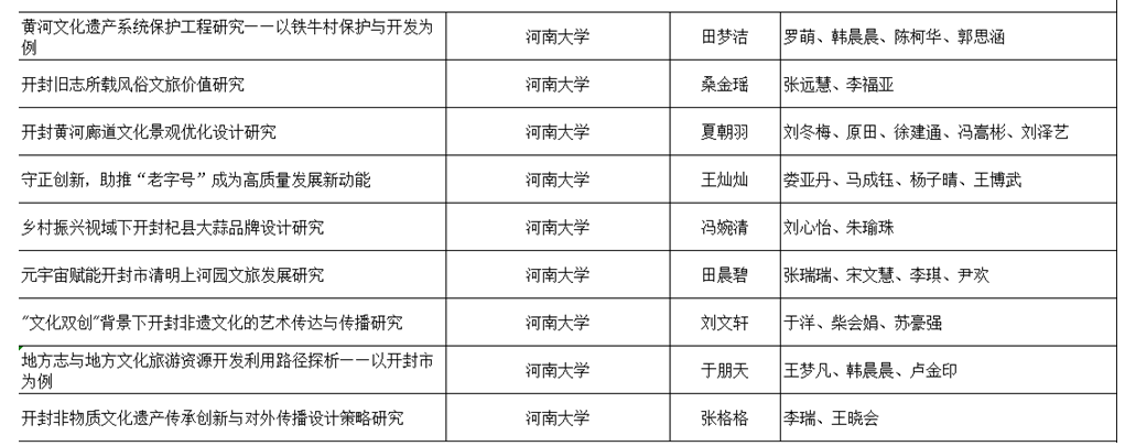 从获奖课题名称来看,大多数研究均与开封特有的风俗文化与非物质文化遗产相关。研究者多选取与自己专业相关的开封特色文化对象与自己的专业相结合,从艺术传播、文旅开发、景观和产品设计等角度切入研究,充分发挥了必赢bwin官方网站的学科优势。