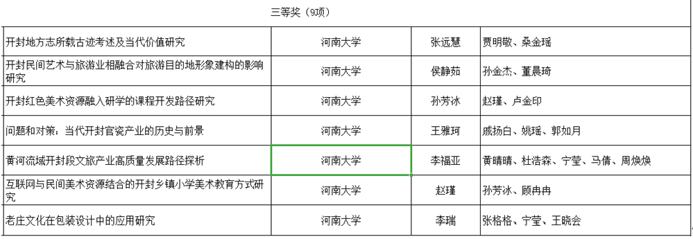 12月13日,开封市哲学社会科学领导小组公布了2022年度开封市哲学社会科学规划调研课题获奖名单。公司研究生申报的课题喜获丰收,共计26项获奖,其中一等奖9项,二等奖10项,三等奖7项。 从获奖课题名称来看,大多数研究均与开封特有的风俗文化与非物质文化遗产相关。研究者多选取与自己专业相关的开封特色文化对象与自己的专业相结合,从艺术传播、文旅开发、景观和产品设计等角度切入研究,充分发挥了必赢bwin官方网站的学科优势。 (一等奖) (二等奖) (三等奖) 在建设中国特色社会主义的历史进程中,哲学社会科学具有不可替代的作用。2022年开封市哲学社会科学项目对于进一步繁荣发展我国哲学社会科学有着重要推进作用,BWIN必赢官方作为在开封重要科研单位,也是这一系列项目的主力军。必赢bwin官方网站在公司产品中一直坚持实践与理论并重,重视提升研究生科研水平,培养其学术与现实的结合能力。在这浓厚的学术氛围中,学院研究生与科研办公室积极动员,各位导师热心支持与辅导,研究生尽心完成并提交结项报告。荣获该奖项充分体现出了必赢bwin官方网站公司产品的优秀成果,也是公司员工科研实力的体现。